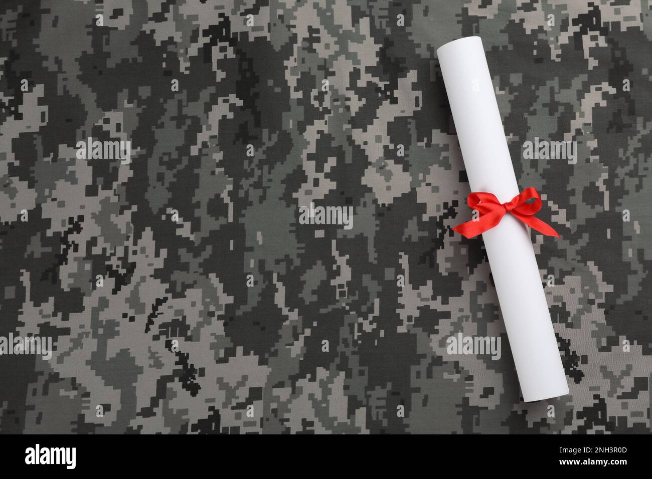 Top view of diploma with red ribbon on camouflage background, space for